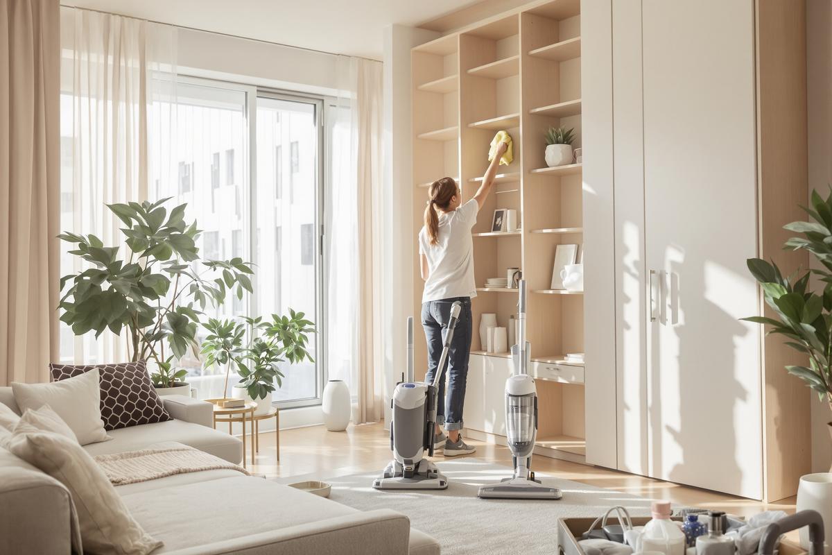 Besser: Immer von oben nach unten putzen. Erst Deckenlampen, Regale und Fensterbänke, dann Böden und Teppiche. So landet der Staub nur einmal unten – und du entfernst ihn am Schluss komplett.